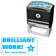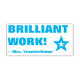 This motivating rubber stamp design features the positive feedback message "BRILLIANT WORK!" and a customized educator name. It also features a decorative star shape icon. It could be used by a school teacher or educator when grading student work, to acknowledge that a student has done an exceptional job.
