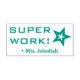 This motivating rubber stamp design features the motivating message "SUPER WORK!" and a personalized teacher name. It also features a decorative star outline shape. It could be used by a teacher or educator when marking assignments, to acknowledge that the student has done a great job.