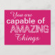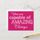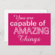Send someone inspiring vibes for the feel good factor with the encouraging words You Are Capable of Amazing Things in artsy typography in white on a background of vibrant hot pink.