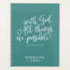 A modern typographical Christian planner featuring the Bible verse Matthew 19:26 With God all things are possible" in white whimsical script font, personalized with your name and year at the bottom. The background colour is in modern teal, which can be edited.