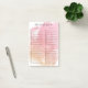 Organiser quotidiennement des blocs-notes post-it avec des listes de tâches dans quatre catégories : asap, buy, call/email, clean, mais vous pouvez les personnaliser selon vos propres besoins. Le bloc-notes pratique dispose d'un lavement à l'aquarelle dans un dégradé allant de la pêche au rose. Ajoutez votre nom dans un script charmant.
