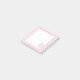 Petites notes carrés avec un arrière - plan rayé rose et blanc. Un cadre blanc avec une bordure rose superposée. À l'intérieur du cadre est l'illustration d'une mère et d'un bébé lapin debout ensemble. Bouches jaunes dans l'arrière - plan. Des papillons géants.