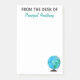 Bloc-notes de post-it personnalisé par globe de directeur d'aquarelle. Globe bleu et vert d'une aquarelle du monde pour le chef d'établissement mondain. Du bureau de est écrit dans le gris et le nom de chefs d'établissement est écrit dans un manuscrit vert. Le globe est dans le coin droit inférieur du bloc - notes. Un pratique et un amusement ont personnalisé le cadeau pour un collège élémentaire et ou un chef d'établissement de lycée. www.SamAnnDesigns.com