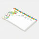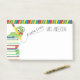 Ce coussin de notes Jumbo Post-it® présente un graphique de joli ver de livres assis sur le dessus d'une pile de livres. Le design est accentué par des rayures de couleur primaire sur le dessus. Le haut du pavé indique "A NOTE FROM" avec le texte comestible pour le nom de l'enseignant. Cela fait un grand cadeau pour un enseignant.