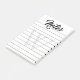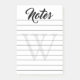 Des post-its liés avec des notes écrites en haut dans un script de calligraphie audacieux. Sous les lignes, un monogramme gris pâle.
