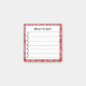 This small square 3x3 sticky notepad can be personalized with a name or message. It says "Notes to Self", and is music themed with musical notes on the lines. It can make a nice stocking stuffer for a musician or music lover. There is a red and pink floral pattern border.