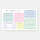 Notes postales pratiques pour votre planification personnelle quotidienne avec des catégories pastel. Écrivez les choses pour être reconnaissant, gardez une trace de la quantité d'eau que vous buvez, combien de fois vous avez étiré tout au long de la journée, et votre nombre de pas. Joignez une affirmation pour la journée, écrivez vos repas et ajoutez une liste de choses à faire. Il y a aussi de la place pour ajouter des notes ou des choses à retenir. Personnalisez avec votre nom dans un joli script.
