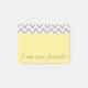 Un motif gris et blanc décore ce billet jaune qu'il note. Personnalisez ces Notes de poste en modifiant le texte. Ces billets il note sont super pour l'école, l'université, les étudiants, les enseignants, la maison, le bureau, etc... Le design est de l'art original.