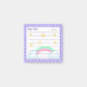 Vous cherchez une façon mignonne et créative de rendre vos notes plus gaies et amusantes? Si c'est le cas, vous devez extraire le nouveau Post-it avec un cadre blanc qui a des arêtes à échelles et un effet d'ombre. À l'intérieur du cadre, les étoiles jaunes et les nuages aux arcs-en-ciel apportent légèreté et tranquillité à vos notes. Et il y en a plus ! Les lignes pour écrire vos notes sont violettes, ainsi que l'espace pour mettre la date et votre nom, qui peut être customisé. Avec un arrière - plan violet avec des pois blancs, le Post-it est parfait pour noter des rappels, des listes de choses à faire, des numéros de téléphone ou même un message romantique pour cette personne spéciale. Alors pourquoi continuer à utiliser des notes ennuyeuses et simples quand vous pouvez avoir un Post-it si beau et charmant ? Choisissez le vôtre maintenant et rendre vos notes plus colorées et amusantes!