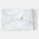 Photo d'un aigle à tête blanche perché sur une branche d'arbre qui surplombe la zone. L'image a été créée en hiver. Les feuilles ont quitté les arbres et les branches ramassent des morceaux de neige. Quelques taches de flocons de neige tombent sur l'arrière des plumes de l'aigle. Le ciel est couvert de nuages. Copyright ©2021 Kimberly J Tilley.