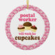 Postal Worker ornament has funny will work for cupcakes quote and a trio of cute chocolate cupcakes occupation design. It makes a great Christmas gift idea or retirement gift for a woman or female Postal Worker.
