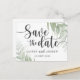 Simple et élégant enregistrer la carte postale date. Doté d'une calligraphie minimaliste de style manuscrit et d'un feuillage tropical en vert. Facile à customiser avec vos informations uniques.