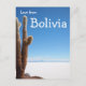 Carte postale d'un cactus géant sur les salines blanches du Salar de Uyuni en Bolivie avec le texte : 'Amour de Bolivie'.