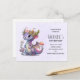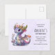 Carte postale d'invitation d'anniversaire avec une illustration d'un dragon mythique. Écailles violettes et bleues. Une couronne dorée fleurie avec des cornes orne sa tête. Magique, amusant et amical.