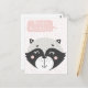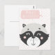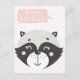 Nouvelle carte de vœux - Carte postale, avec un adorable raton laveur noir, blanc et gris en aquarelle, avec une bulle de texte rose contenant un vœu "Joyeux Anniversaire", sur un fond rose et blanc amusant à motif abstrait.