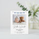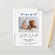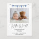 Carte de naissance simple avec une photo moderne sur le devant, avec un drapeau de bouvreuil bleu, un titre en calligraphie moderne et un texte noir. Cette carte de naissance moderne est un moyen doux d'annoncer la naissance de votre nouveau-né garçon.