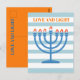 Changez vos souhaits Hanoukka avec ce design moderne rayé Menorah. Toujours dans les couleurs traditionnelles de saison. La Menorrah bleue est orangée. Blues et oranges. Il y a de la place pour votre message de vacances sur le dos avec le mot "Amour et lumière" qui peut être supprimé si vous ne voulez pas l'utiliser. Accueil Hanoukka moderne et simple.
