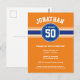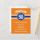 Des rayures bleu royal et un fond orange mettent en valeur cette carte d'invitation pour une fête d'anniversaire sur le thème du sport. Le design comprend un motif de maillot de sport avec un espace pour mettre en évidence le nom et l'âge du garçon qui fête son anniversaire.