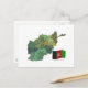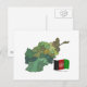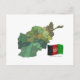 Cette carte postale a la carte et le drapeau de l'Afghanistan avec la carte montrant toutes les provinces. Chaque province est indiquée dans une couleur verte différente et porte le nom de la province. Le drapeau afghan est brandissé et sous le drapeau se trouvent les mots "République islamique d'Afghanistan".