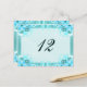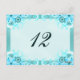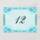 © Sunny Mars Designs - Floral Hibiscus : Light Aqua Blue ou Turquoise Mariage Numéro de table Cartes - Belle, design personnalisé de réception numéro de table de mariage modèle avec une illustration moderne et élégante d'une jolie décoration florale d'hibiscus tourbillonnant bleu aqua classe contre un arrière - plan turquoise.