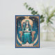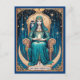 Carte postale dans "La Haute Prêtesse", un archétype tarot, assis sur un trône orné, tenant un cristal brillant. Elle porte une coiffure complexe ornée d'accents dorés. Une chouette, symbolisant la sagesse, se perche à côté d'elle.