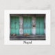 Carte postale de chiens errants dormant dans la rue devant de vieilles portes vertes sales à Katmandou, la capitale du Népal avec une frontière blanche et le texte : 'Népal'.