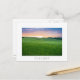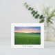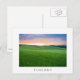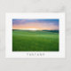 Carte postale d'un paysage avec des champs roulants avec des blés verts au coucher du soleil dans la vallée du Val d'Orcia en Toscane, Italie avec une frontière blanche et le texte : "Toscane".