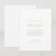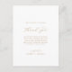 Cet élégant script or merci carte de réception est parfait pour un mariage simple. Le design minimaliste or et blanc présente une typographie romantique avec style glamour moderne. Personnalisable dans n'importe quelle couleur. Gardez le design minimal et élégant, tel quel, ou personnalisez-le en ajoutant vos propres graphiques et artwork. Placez ces cartes à la table de chaque invité à la réception de votre mariage. Personnalisez la carte avec vos noms et un message de remerciement spécial.