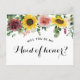 Demandez à vos amis et à votre famille de faire partie de votre mariage avec cette carte florale "Veux-tu être ma demoiselle d'honneur" avec des éléments botaniques verts, des tournesols et des roses avec une écriture calligraphique féminine. Des articles assortis sont disponibles. Carte de demande pour la mariée