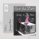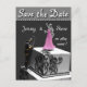 Carte de sauvegarde de date avec un pompier et une mariée sur le dessus d'un gâteau. Correspond également à l'ensemble d'invitation ci-dessous: