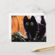 Carte postale avec un mignon petit chat noir effrayé avec de grands yeux verts debout à côté d'un citrouille. Purrfect pour les salutations d'Halloween ! Who Dat Scaredy Cat de l'artiste Michaeline McDonald. Commandez un portrait de chat effrayé de votre chat à www.wisetailsart.com .