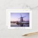 Carte postale avec un moulin à vent lors d'un lever de soleil violet en hiver avec une fine couche de neige et de glace sur l'eau au site du patrimoine mondial de l'UNESCO Kinderdijk aux Pays-Bas avec une bordure blanche et le texte : 'Pays-Bas'.