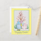 Carte Pâques mignonne avec nome de style tomte aquarelle avec bouquet de fleurs printanières, une maison en forme d'oeuf, arbre en fleurs et arrière - plan jaune pastel, avec texte personnalisable "Pâques joyeux".