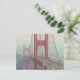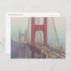 The image shows a partial view of the Golden Gate Bridge in San Francisco, shrouded in fog. The bridge's distinctive red-orange colour is visible, contrasting with the grey fog. Cars are seen driving on the bridge. The background features blurred hills and sky due to the fog. The overall mood is atmospheric and slightly mysterious.