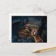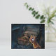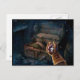 A suspenseful postcard featuring the unexpected discovery of a magical item in an old chest.