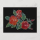 Hibiscus blossoms. Red flowers with green leaves (pieces of image outlined in beige, giving a textured look) on black background. Hibiscus image taken from original silk painting by Susan Lilly.