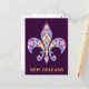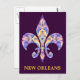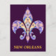 This postcard design features a kaleidoscope fleur de lis on a purple background with the words New Orleans in gold letters.