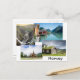 Postcard with 4 landscapes in Norway, a boathouse, boats and a fjord and a stave church with a white border and the tekst: 'Norway'.