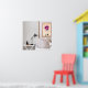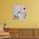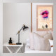 Une chambre moderne dispose d'une table de nuit blanche avec une lampe noire et des objets de décoration, à côté d'un lit avec des coussins à motifs. Un cadre représentant des lèvres vibrantes et deux personnes assises apporte une touche de couleur à la décoration minimaliste. Une image amusante dans une image. Disponible dans de nombreuses autres tailles, ce design peut également être transféré sur 1000 d'autres produits et peut souvent être personnalisé avec le texte de votre choix. Également disponible pour téléchargement instantané.
