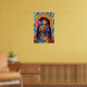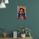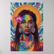 This stunning wall art poster is an explosion of vibrant hues and intricate patterns, celebrating the beauty and strength of a woman adorned in traditional and artistic elements. The central figure's face is a masterpiece of geometric abstraction, with bold, contrasting blocks of colour – including deep greens, blues, reds, and yellows – forming her features and highlighting her striking eyes.