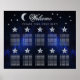 Un plan de table de mariage à 10 tables pour un thème de mariage céleste, avec la lune et l'étoile sur un fond bleu ciel étoilé. Les numéros de table sont écrits en grandes étoiles grises argentées. La lune, les étoiles et le mot Bienvenue (écrit dans une police calligraphique élégante) sont gris argenté, le reste du texte est blanc.