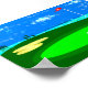 Poster représentant une illustration numérique du 18e trou sur un terrain de golf avec un ciel bleu nuageux, lac, arbres, piège à sable et le ballon de golf assis sur le vert, à quelques centimètres de la tasse en attendant d'être mis en place.