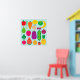 Un motif de fruits et légumes joyeux et colorés sur un arrière - plan bleu, y compris une pêche, banane, ananas, pastèque, poire, cerises, radis, aubergine (aubergine), bruxelles sprout, pois, radis et poivron rouge (poivron).