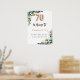 Un arrière - plan blanc chic. Décoré avec des feuilles d'eucalyptus couleur verte, des sprigs, de la verdure, des feuilles faux or. Personnalisez et ajoutez le nom. Lettres noires et dorées. Le numéro 70 est écrit avec une police de style ballon.