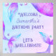 Shellebrate ! Fête de la Sirène bienvenue affiche avec la queue de sirène magique et la typographie décorative. Le dicton amusant dit "Bienvenue à la fête d'anniversaire de [Nom] .. Shellebrate !" que vous pouvez personnaliser. Ce design lumineux et dynamique présente des queues de sirènes et des bulles océaniques dans des tons d'aquarelle de violet rose vert et bleu turquoise. Facile à customiser et parfait pour la fête de sirène, la fête de la piscine, la princesse girly et sous les thèmes de la mer.