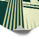 This design features a bold geometric composition in shades of dark and light green. Thick diagonal lines intersect at sharp angles, creating a strong sense of motion and structure. Subtle paint splatters and scattered dots add a raw, textured feel that contrasts with the clean, organized layout. Overall, this design conveys energy, balance, and dynamic visual tension.