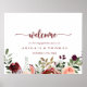 Cette affiche de bienvenue pour une fête de fiançailles florale d'été rustique est parfaite pour une célébration de fiançailles moderne. Le design présente des fleurs aquarelles bordeaux, rose et rose pâle avec des feuilles vertes sur un fond teinté brunâtre.