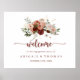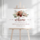 Cette affiche de bienvenue pour fête de fiançailles florale rustique or est parfaite pour une célébration de fiançailles moderne. Le design présente des fleurs de marsala, rose, blush, bordeaux et or peintes à la main avec des feuilles vertes disposées en de magnifiques guirlandes.