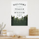 Bienvenue dans votre mariage rustique, boisé ou montagnard avec notre affiche Tall Pines, avec une bordure inférieure de pins à feuillage persistant dans des tons riches de vert chasseur. Ajoutez vos noms, votre date de mariage et le texte d'accueil personnalisé en utilisant les champs fournis.