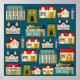 Illustrations colorées pour salle de jeux de kis. Joli arrière - plan bleu marine. Maisons et ville.